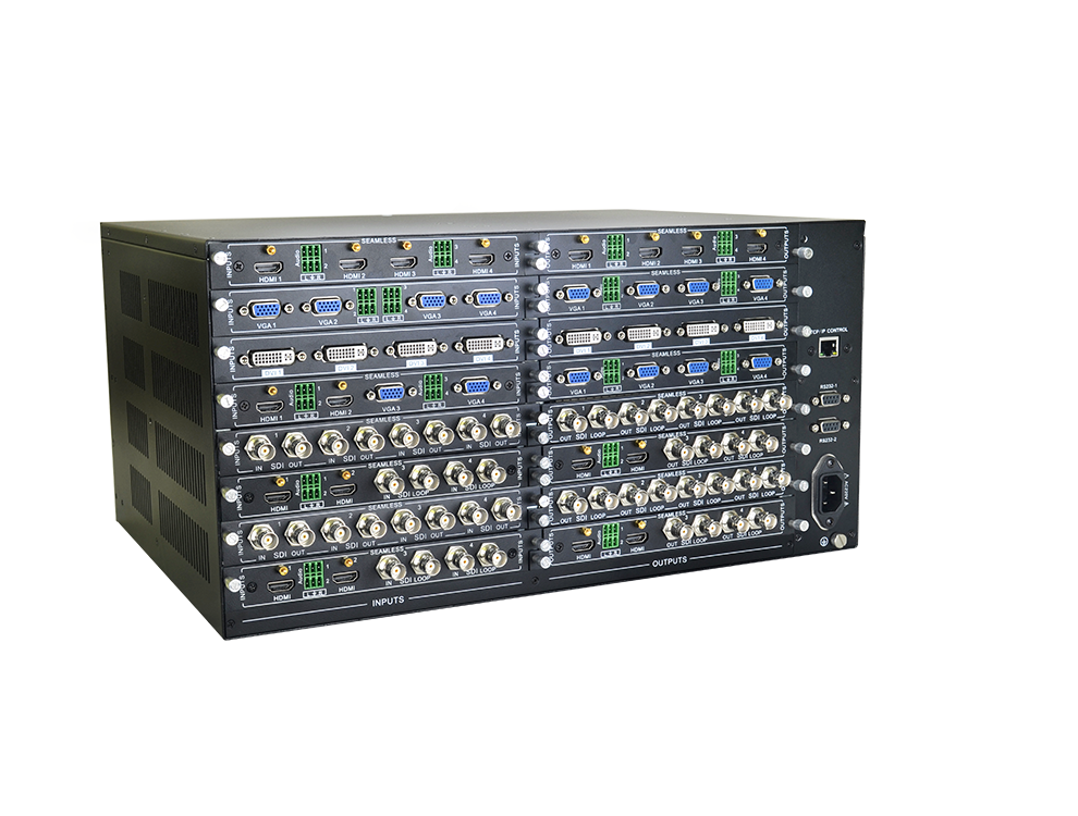 1.可配置信号卡的模块化矩阵主机,最大可支持32x32路的音视频信号切换卡接口,支持热插拔。
